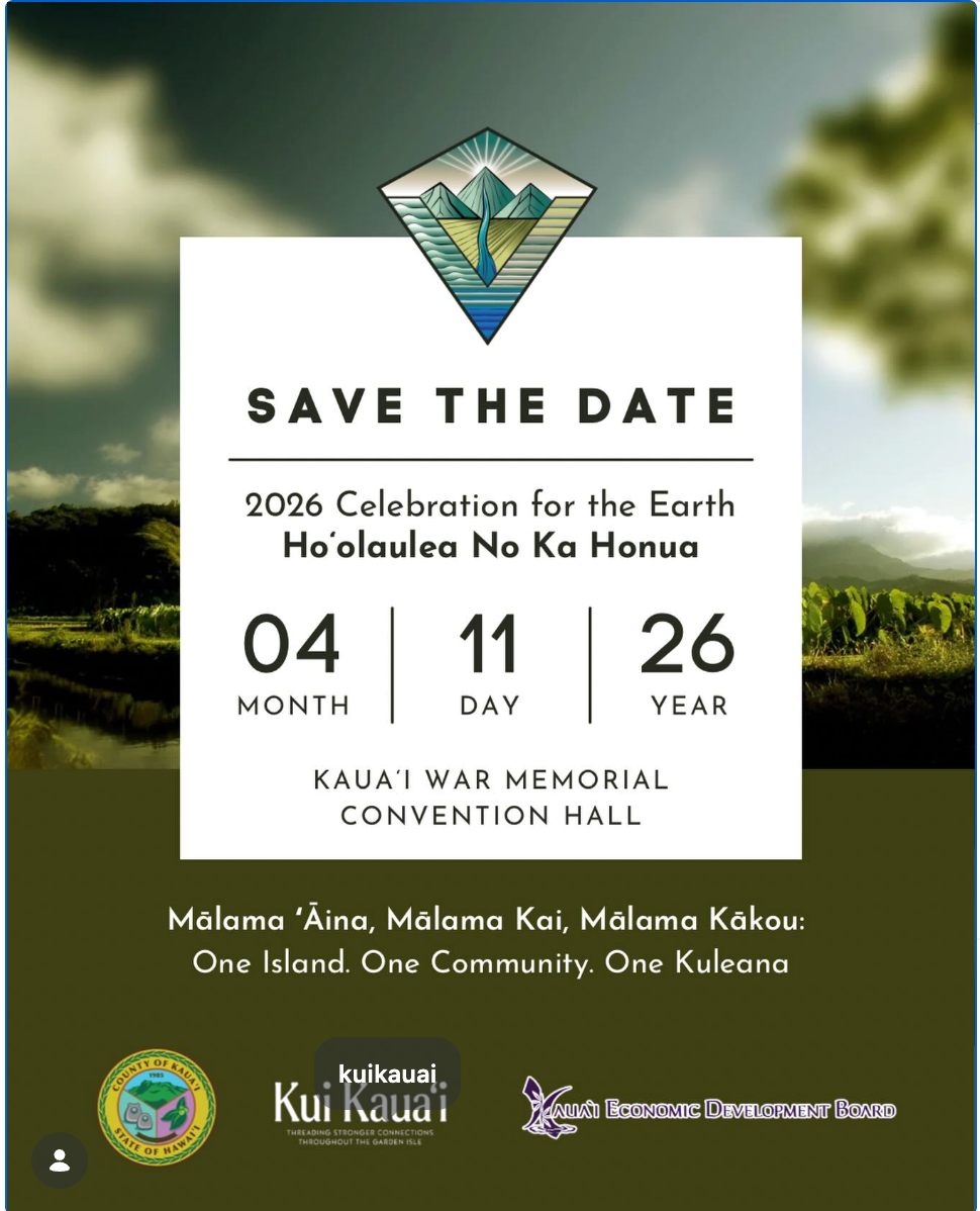The 2026 theme, Mālama ʻĀina, Mālama Kai, Mālama Kākou, honors the many organizations working toward sustainability and recognizes the collective impact of caring for our land, ocean, and one another to build a more resilient island. This event includes CRB information and presentations. Hosted in partnership with the Kauaʻi Economic Development Board, County of Kauaʻi and Kui Kauaʻi. It will be a powerful day of connection, inspiration, and action as we celebrate our island and our shared commitment to protecting it for generations to come.