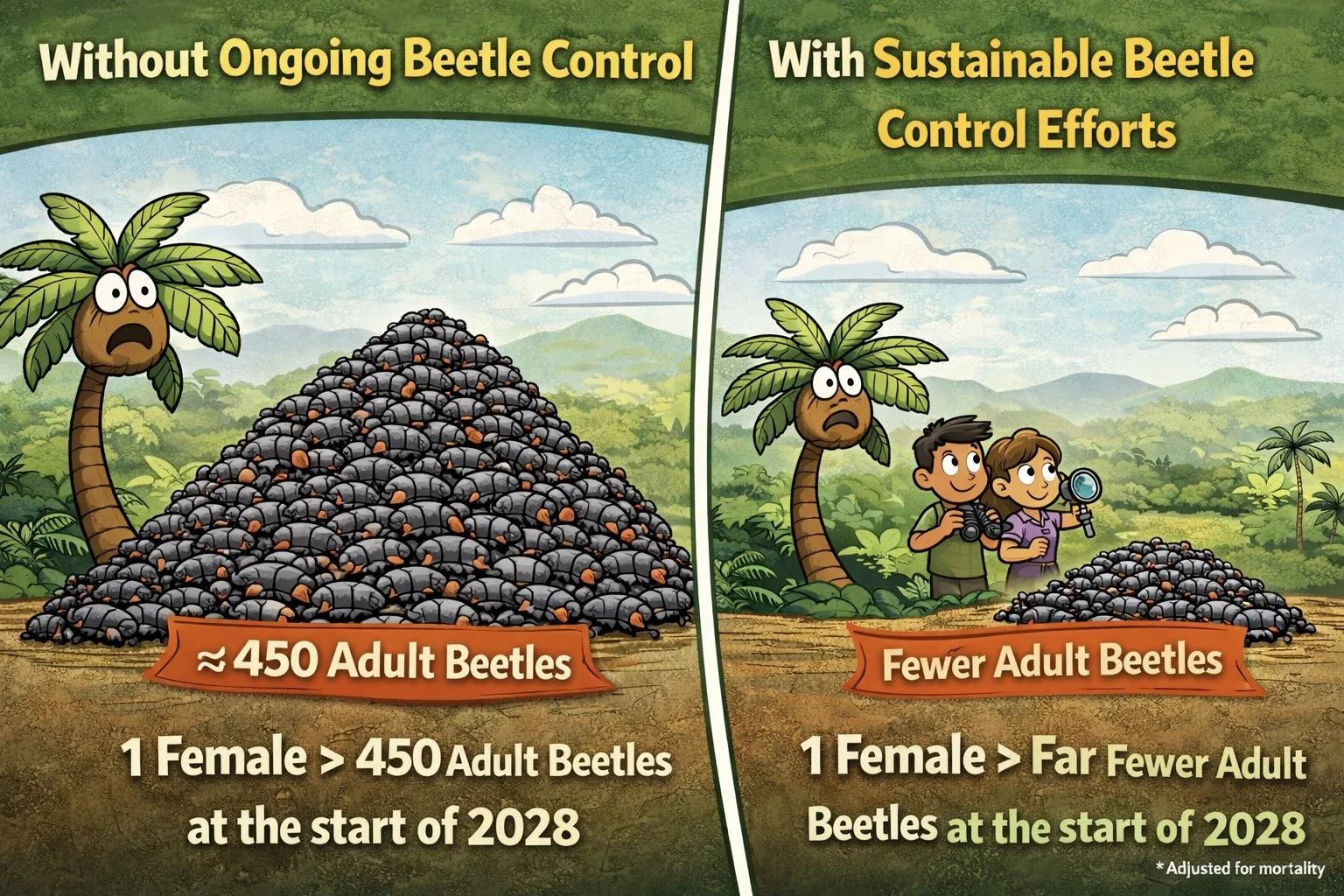 Based on the data we can find from various sites, it appears that the average lifetime of a female beetle is roughly one year, and, during that time, she lays about 90 eggs. About 1/3 of them survive to become about 30 adult beetles, and we can guess that about half of those are fresh lady beetles. So, if my math is correct, for the next three years, if we don’t make any major efforts to eliminate breeding sites or to trap and kill beetles, we would end up with each of the female beetles that are now alive turning into 450 adult beetles in early 2028. If half of the beetles alive right now are females, then that would be 225 times the number of beetles on island now. That is a five alarm fire, and we are already in “beetle flames” in many parts of the island! On the other hand, if we get busy eliminating breeding sites and trapping and killing beetles, we could possibly manage our beetle population and preserve many of our palms until the time that a bio control organism is released. That is worth fighting for!
